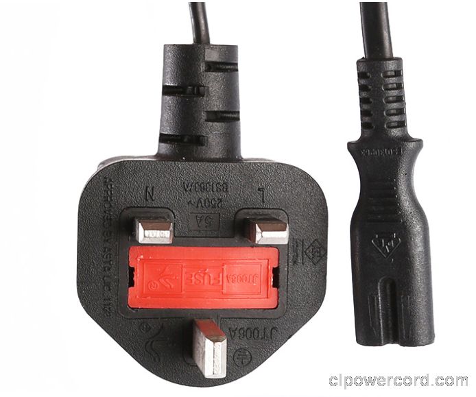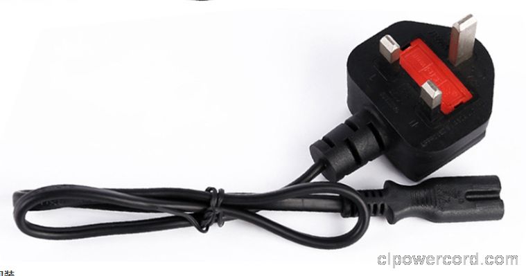 英國電源線 (UK電源)帶保險絲注塑式大英BSI1363A ASTA 額定電流:3A 額定電壓:250V 線芯極性:兩芯插頭 規格標準:BSI 1363A,連接器標準 IEC 60320 (320) C-7,八字尾插座,筆記本插頭。